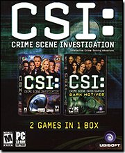 2 CSI: Crime Scene Investigation Games in 1 BoxProduct InformationTake a tour of the criminal mind in all 10 cases from the CSI and CSI: DarkMotives crime-solving games. With only a scattering of clues and the bestreal-world forensic equipment available you must hunt for the truth alongsidethe entire cast of CSI. CSI: Interrogate suspects in CSI with LVPD Detective Brass utilize 14 authentic CSI forensic tools from UV lights to casting kits hunt down field evidence withcutting-edge forensic tools and investigate five crime scenes ranging from arson to police homicide. Team up with the entire cast of CSI and a new improved crime lab in CSI: DarkMotives to track down the heinous truth in five complex new crimes. No crime is ever perfect. Your job is to find the flaw. You play a CSI rookie training with the best agents in Las Vegas. This time however the cases are more complex and a whole new challenge awaits you!Analyze the evidence. Capture the killer.Product Title Included CSI: Crime Scene Investigation CSI: Crime Scene Investigation Dark MotivesProduct OverviewCSI: Crime Scene InvestigationA murdered woman…a slain police officer…a mysterious arson case. What dothese crimes have in common? Enter the gritty world of CSI and search for thetruth with Grissom Catherine and the entire Crime Scene Investigation team.Armed with high-powered forensic equipment and razor-sharp wits delve deep intothe mysteries of 5 baffling crime scenes to reveal the truth. Don't just watchthe action. Live it! Master the tools....solve the crime!Interrogate suspects with LVPD Detective Brass utilize 14 authentic CSIforensic tools from UV lights to casting kits hunt down field evidence withcutting-edge forensic tools and investigate five crime scenes ranging fromarson to police homicide. The dialogue is written by CSI scriptwriter Max AllanCollins and it includes the likenesses and voice